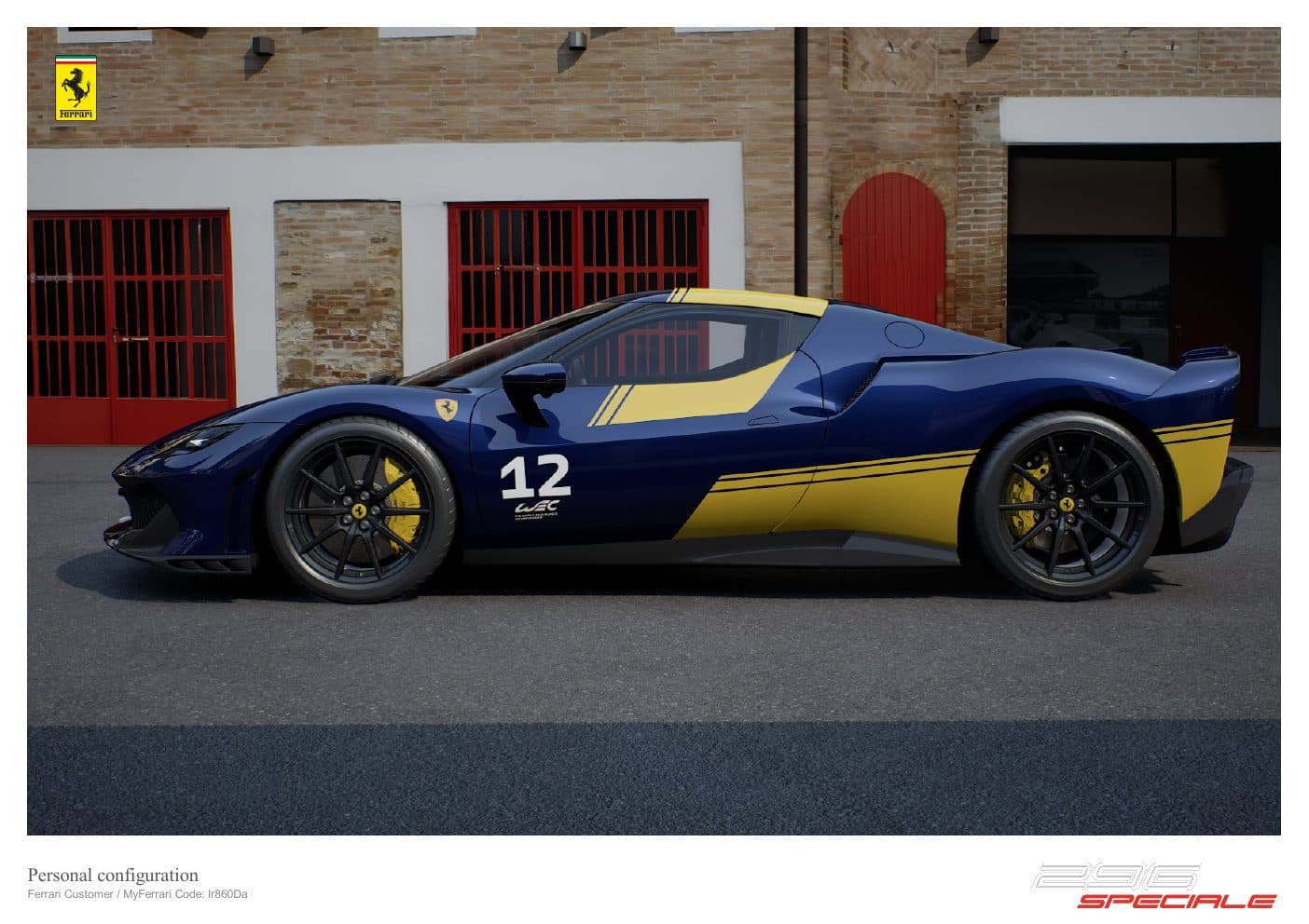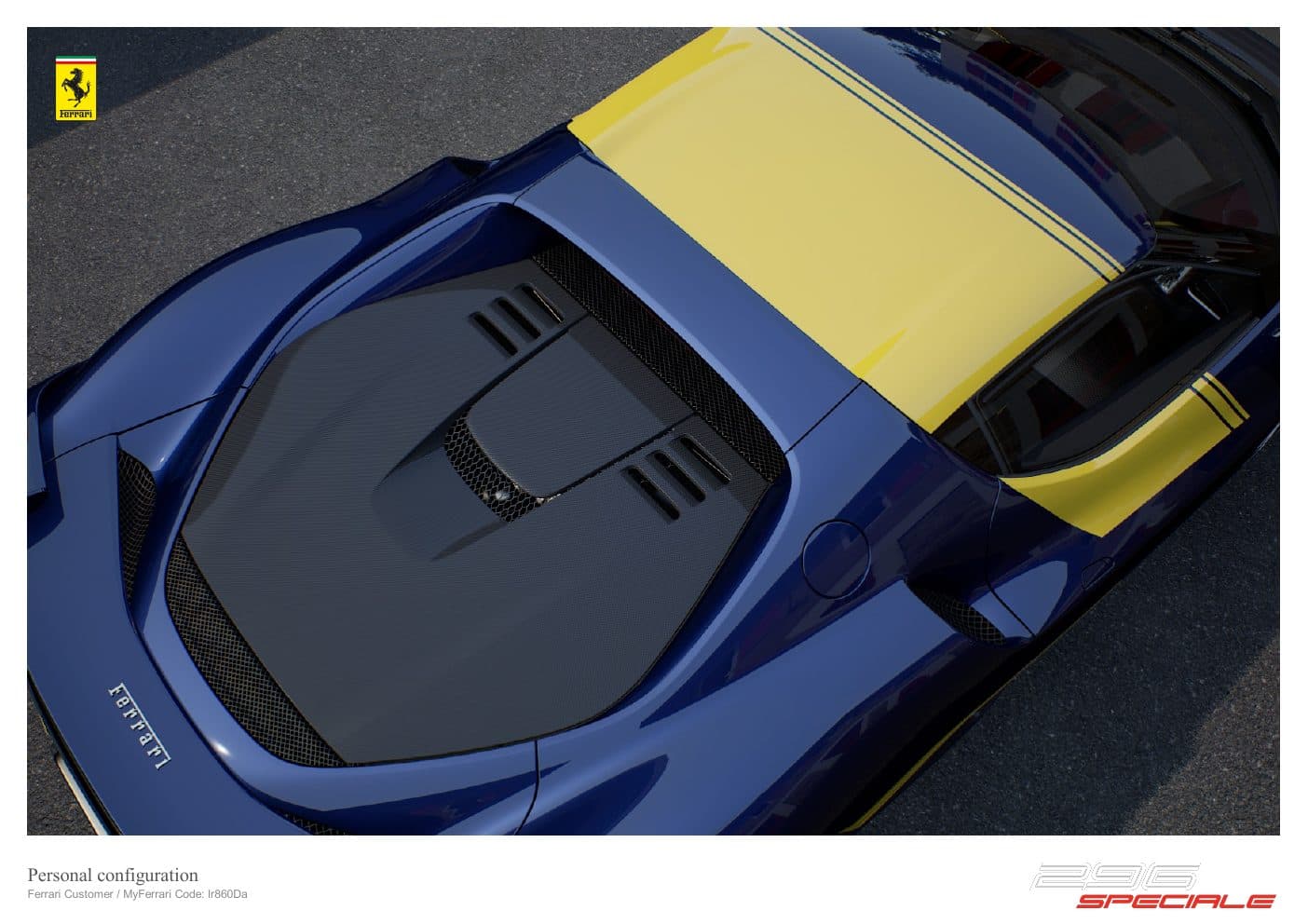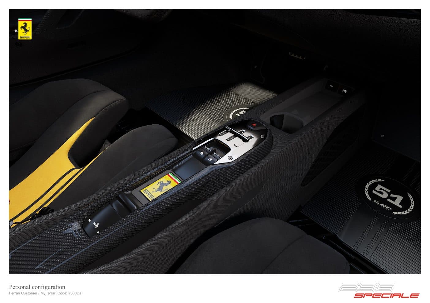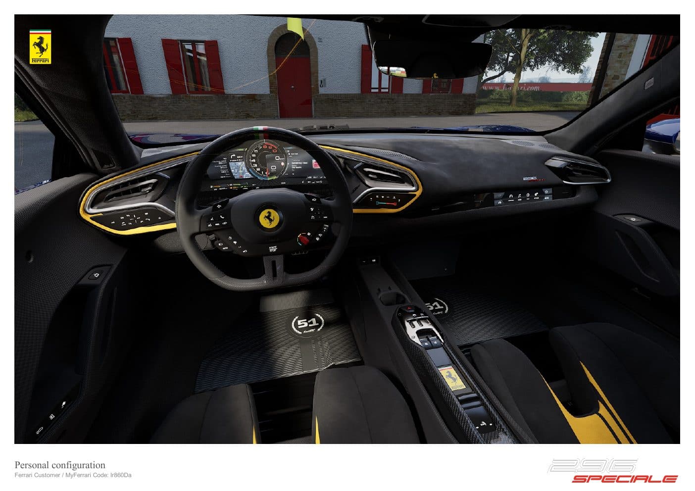 « Cette Ferrari 296 Speciale se distingue par sa livrée Blu Tour de France 70 agrémentée de détails Giallo Modena. Sa configuration Piloti inclut un pack carbone complet, des jantes en fibre de carbone et un habitacle en Alcantara Nero avec harnais de sécurité à quatre points. »