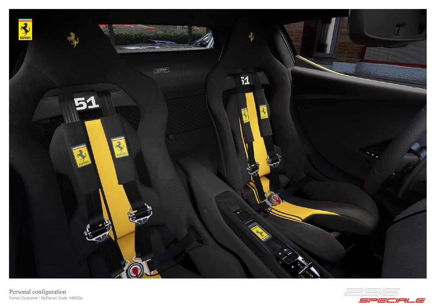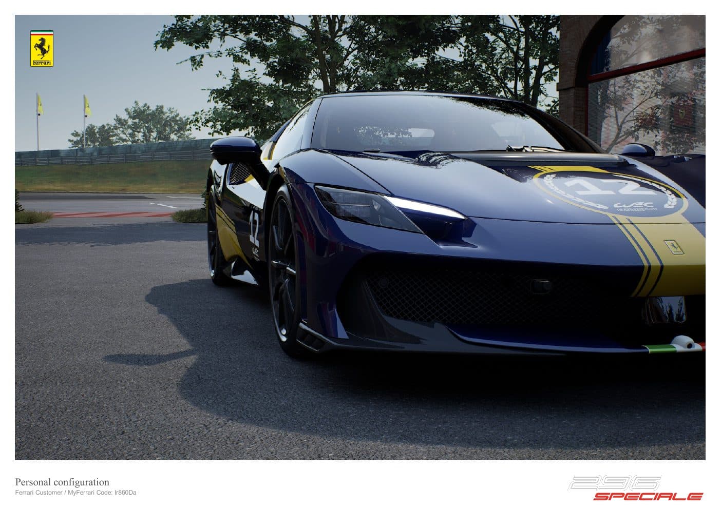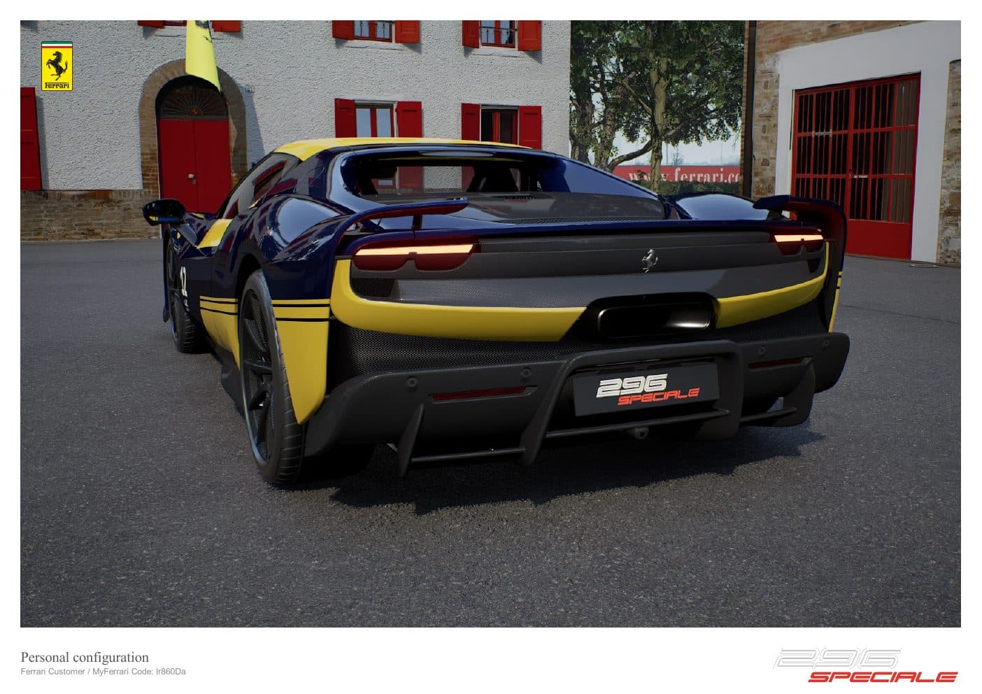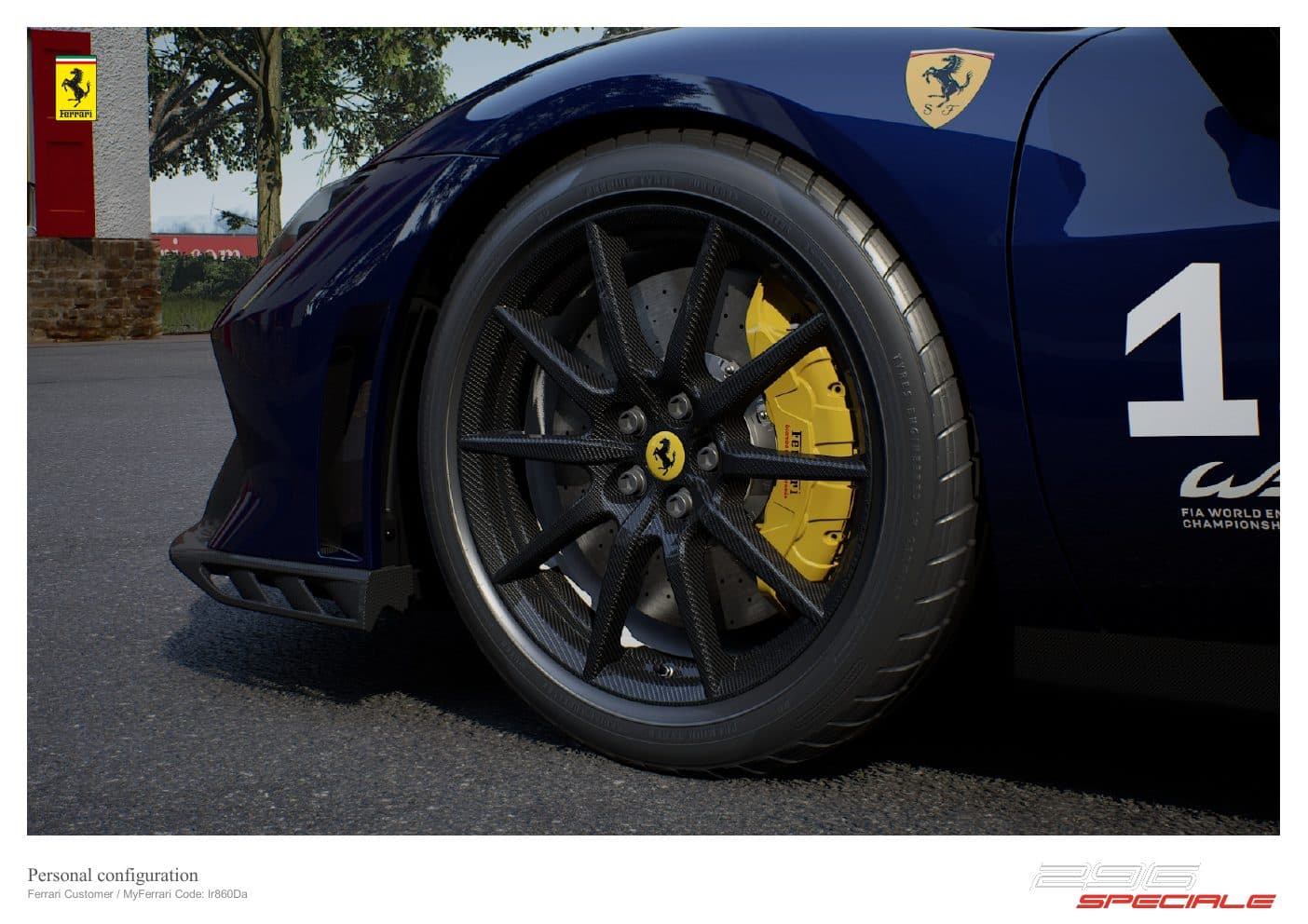 « Cette Ferrari 296 Speciale se distingue par sa livrée Blu Tour de France 70 agrémentée de détails Giallo Modena. Sa configuration Piloti inclut un pack carbone complet, des jantes en fibre de carbone et un habitacle en Alcantara Nero avec harnais de sécurité à quatre points. »